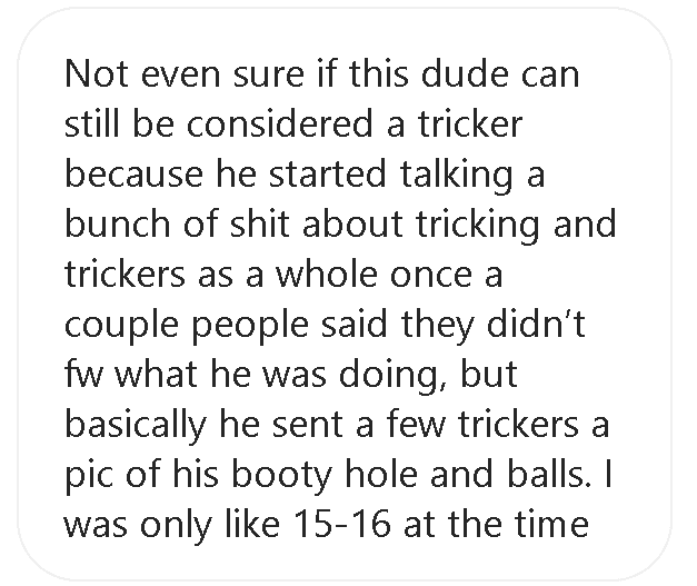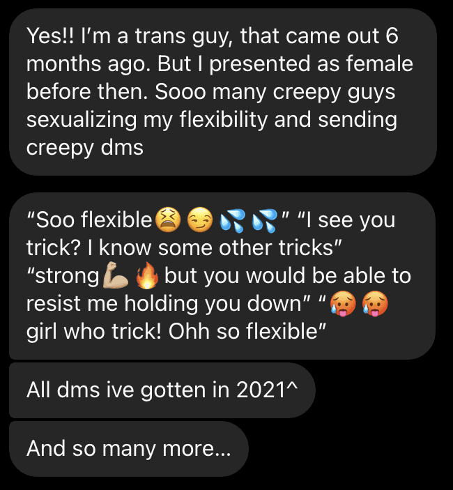 In the screenshots above, you can see for yourself. This is a side of the tricking community that many are unaware of, want to ignore because it's not happening to them, or don’t want to believe because it involves their friends/someone that was cool in person. It’s a tough pill to swallow, but it will make our whole community healthier.
