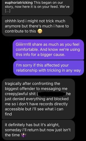 In the screenshots above, you can see for yourself. This is a side of the tricking community that many are unaware of, want to ignore because it's not happening to them, or don’t want to believe because it involves their friends/someone that was cool in person. It’s a tough pill to swallow, but it will make our whole community healthier.