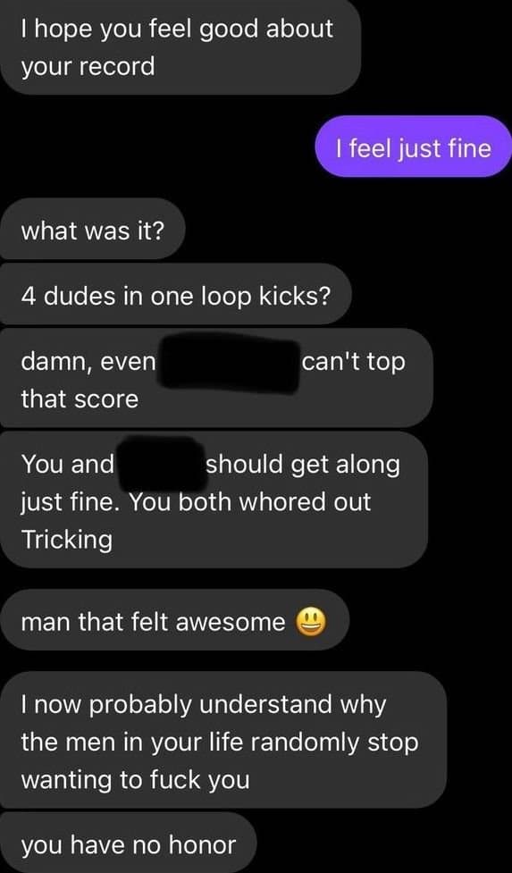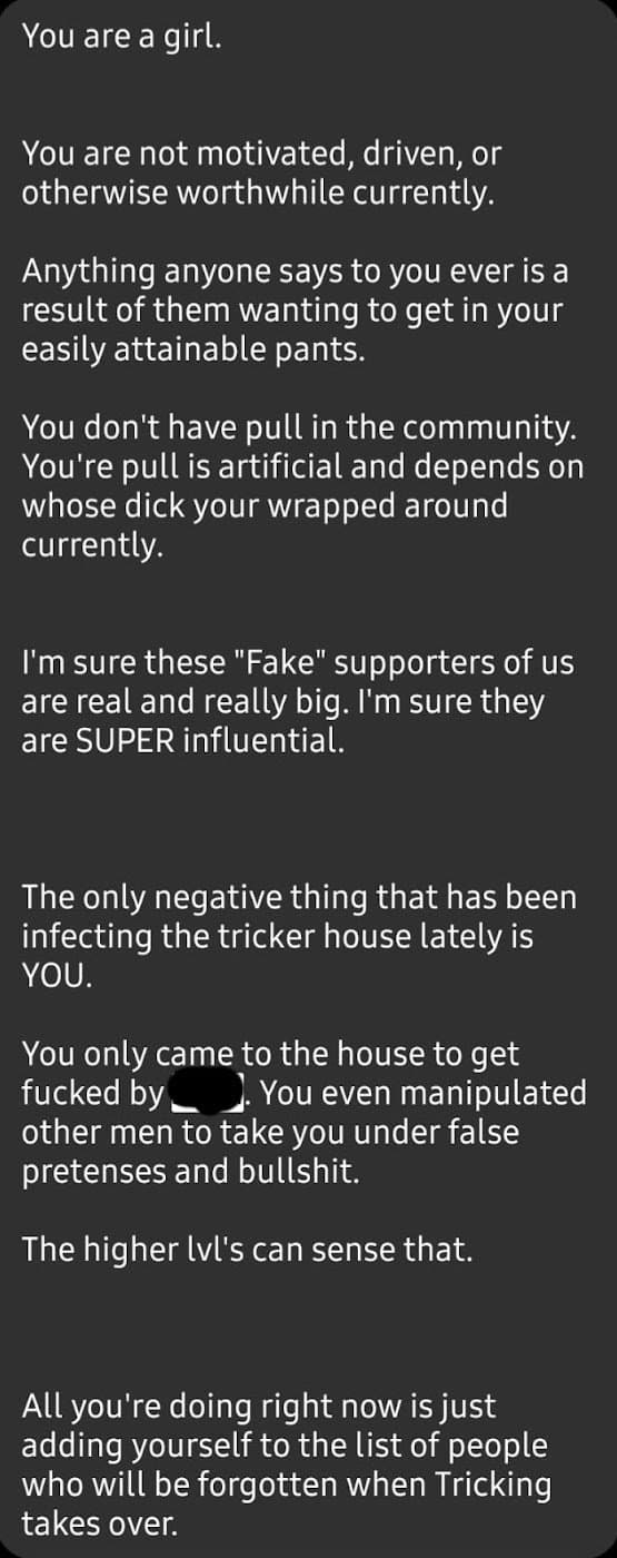 For example, I would sometimes receive really misogynistic, hateful comments. All these years, I thought I was the only one who received these kinds of messages. It wasn’t until Euphoria asked for screenshots that I found out I wasn’t alone. The screenshots in this article were submitted from multiple sources, but this particular one was sent to me when I first started tricking. This was long before Euphoria, when there were only a handful of girls in the community:
